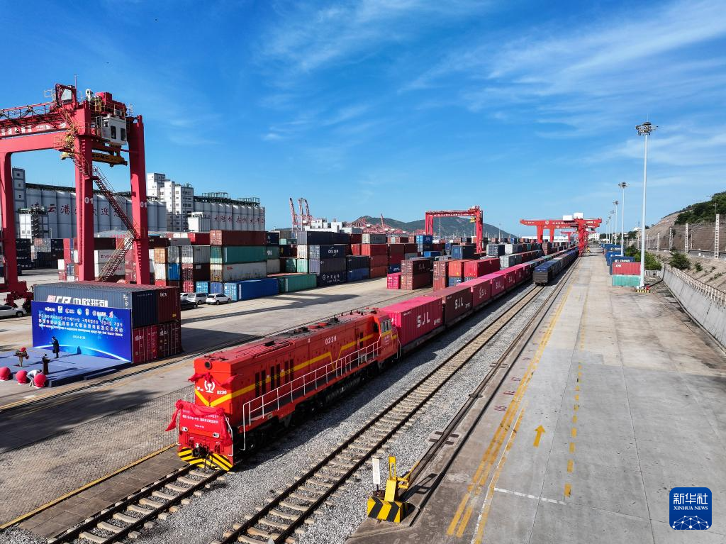 韩国铁道公社参与运营的国际多式联运班列从连云港首发 6月26日,在中哈(连云港)物流合作基地,“韩国-连云港-中亚”国际多式联运班列静待开行(无人机照片)。 当日,一列满载家电、轮胎、汽车配件等货物的“韩国-连云港-中亚”国际多式联运班列从中哈(连云港)物流合作基地出发,驶往哈萨克斯坦、乌兹别克斯坦。班列运载的55个大柜于6月13日从韩国境内发出,经釜山港海运抵达连云港后转由铁路运输。这列由韩国铁道公社首次参与运营的国际多式联运班列的顺利发出,标志着“韩国-连云港-中亚”通道进一步稳固畅通,连云港国际枢纽海港优势日益凸显。 新华社记者 季春鹏 摄