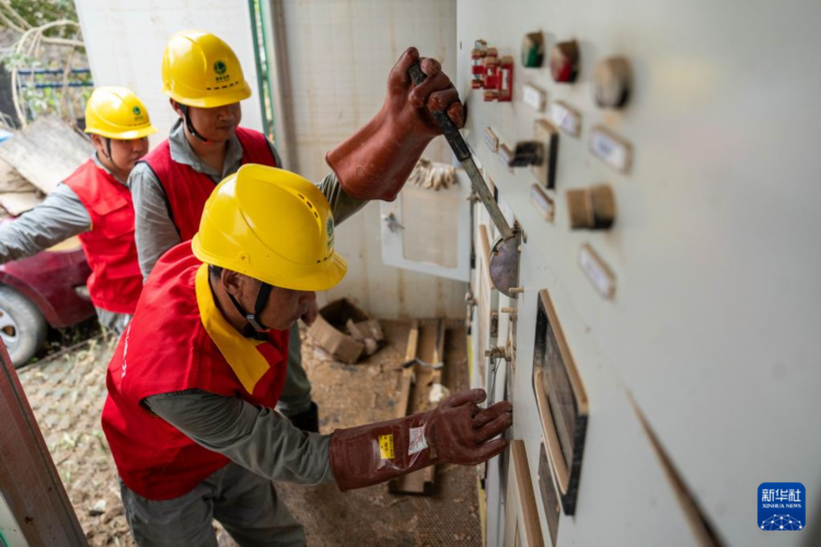 7月3日,在平江县金蓝湾小区,电力工人对配电分支箱开展抢修施工。