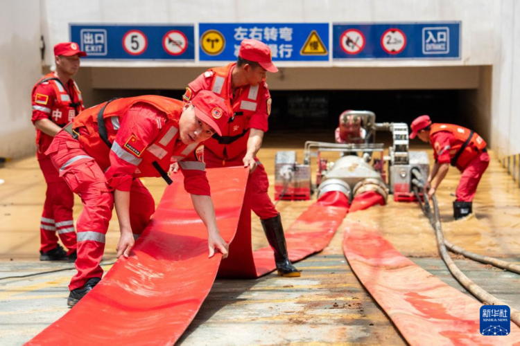 7月3日,在平江县金财花园小区,中国安能集团武汉救援基地应急保障分队队员对地下车库进行排涝工作。