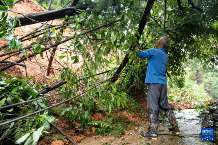 7月2日,在平江县三市镇淡江村,村民徐日康在疏通村路。