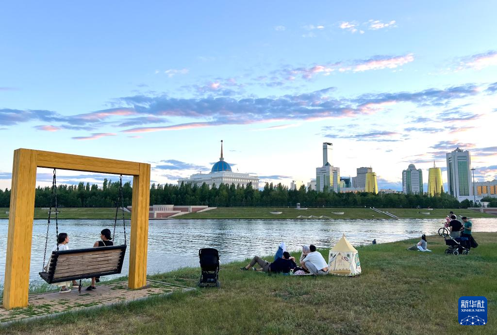 6月29日,人们在哈萨克斯坦首都阿斯塔纳伊希姆河畔休息。