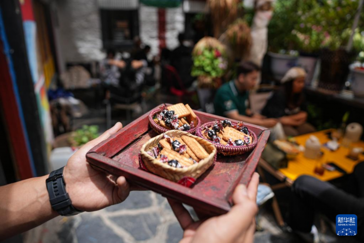 在拉萨老城区内的一座百年古院中,穿着时尚的顾客在一家咖啡馆手捧拿铁,聊天休闲。