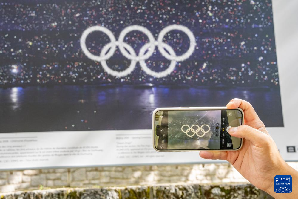 7月6日,一名参观者用手机拍摄联合国教科文组织展出的北京奥运会开幕式照片。 随着2024年巴黎奥运会开幕临近,位于巴黎市中心的杜乐丽花园、货币博物馆、联合国教科文组织等地举办了多个奥运主题展览,介绍奥林匹克历史和文化。 新华社记者 许畅 摄
