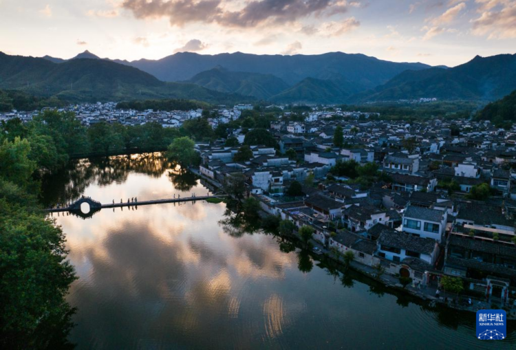 夏日傍晚时分,在拥有900多年历史的中国传统古村落、位于安徽省黄山市黟县的宏村,湖面倒映着晚霞,游人在桥间驻足流连,享受季夏夜晚时光。
