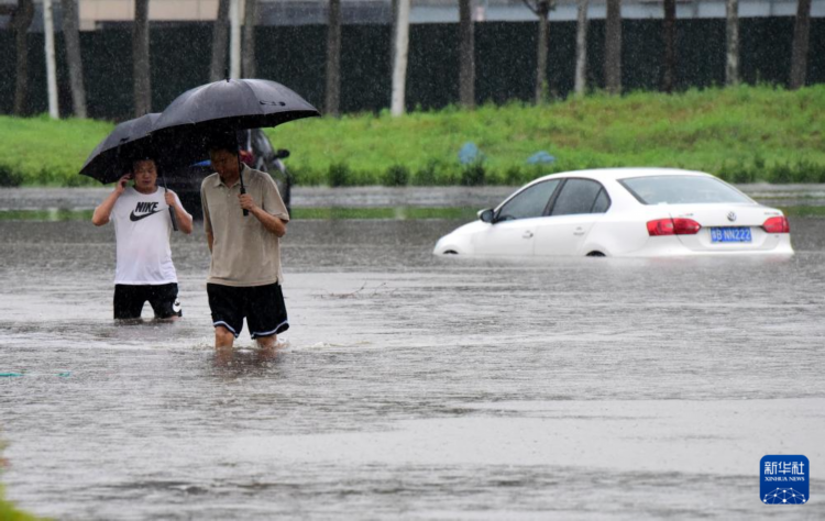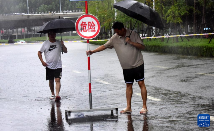 7月8日,工作人员在郑州东四环积水路段设置危险提示牌。