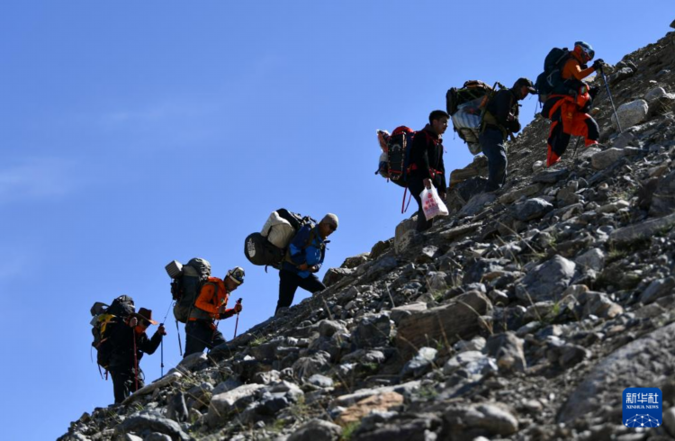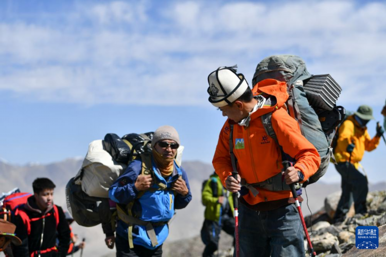 7月4日,塔西巴伊(左二)背着约25公斤的物品和同伴一起行进在慕士塔格峰的山坡上。