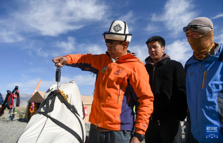 7月4日,在新疆慕士塔格峰一处登山营地,塔西巴伊(左)将登山者的物品称重。高山搬运依据不同海拔路程对所背物品按重量收取费用。