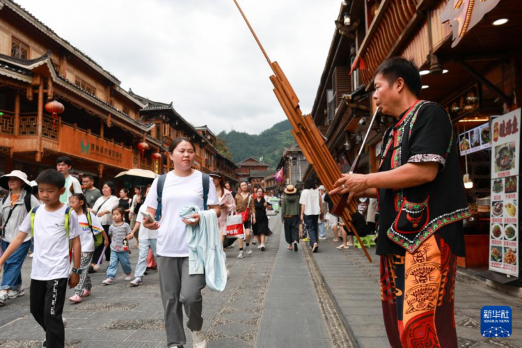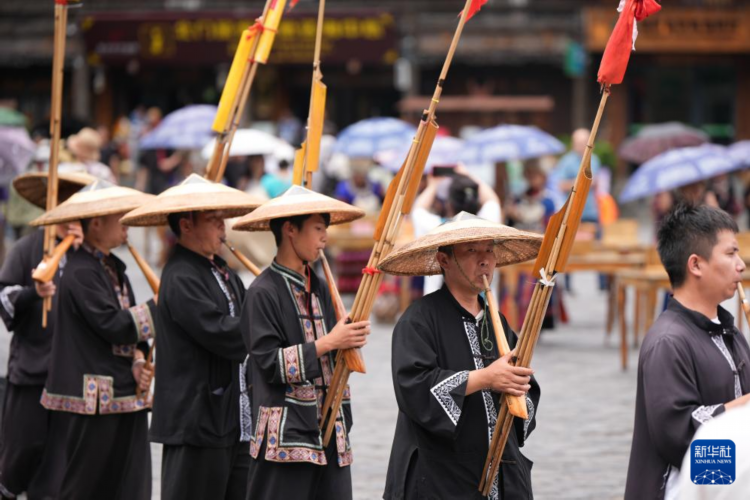 7月9日,演员在西江千户苗寨吹奏芦笙吸引游客。