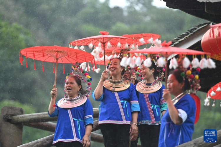 在广西柳州市三江侗族自治县林溪镇平岩村,村民在程阳永济桥头迎接游客(7月6日摄)。