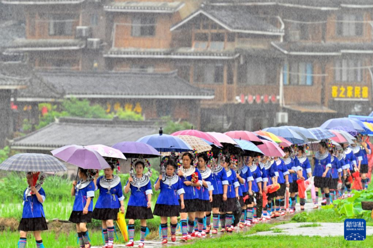 在广西柳州市三江侗族自治县林溪镇平岩村,妇女们身穿节日盛装,庆祝程阳永济桥落成100周年(6月18日摄)。