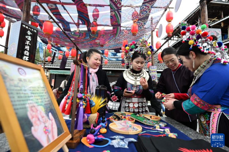 在广西柳州市三江侗族自治县林溪镇平岩村,游客在选购侗族非遗手工艺品(2月3日摄)。