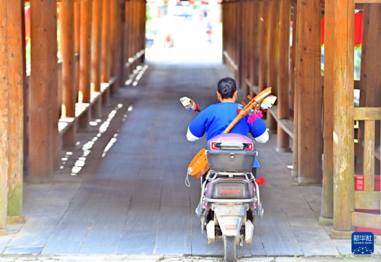 在广西柳州市三江侗族自治县林溪镇平岩村,村民背着侗族琵琶去上班(7月7日摄)。