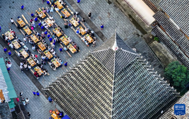 在广西柳州市三江侗族自治县林溪镇平岩村,游客在体验百家宴(无人机照片,7月6日摄)。