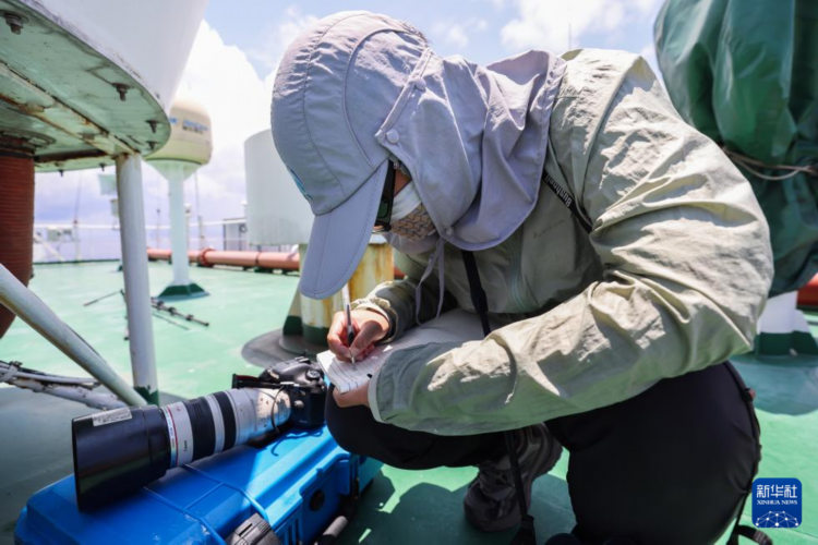 7月7日,在海南岛东部海域,考察团队成员在实时记录观测数据。新华社记者 张丽芸 摄