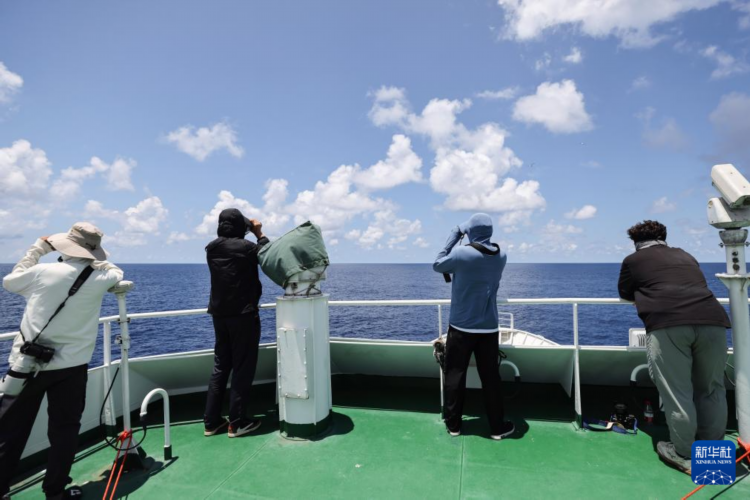 7月7日,在海南岛东部海域,考察团队在甲板上观测寻找“海棠”。新华社记者 张丽芸 摄