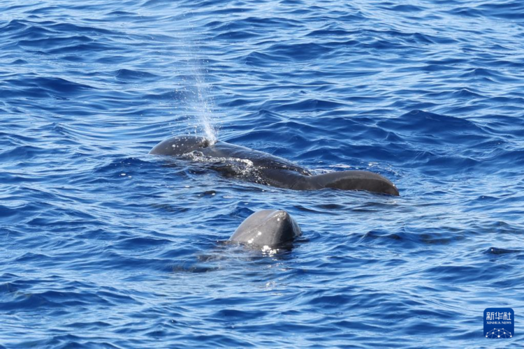 7月5日,在海南岛东部海域,短肢领航鲸母子对中的幼崽(前)在浮窥。新华社记者 张丽芸 摄