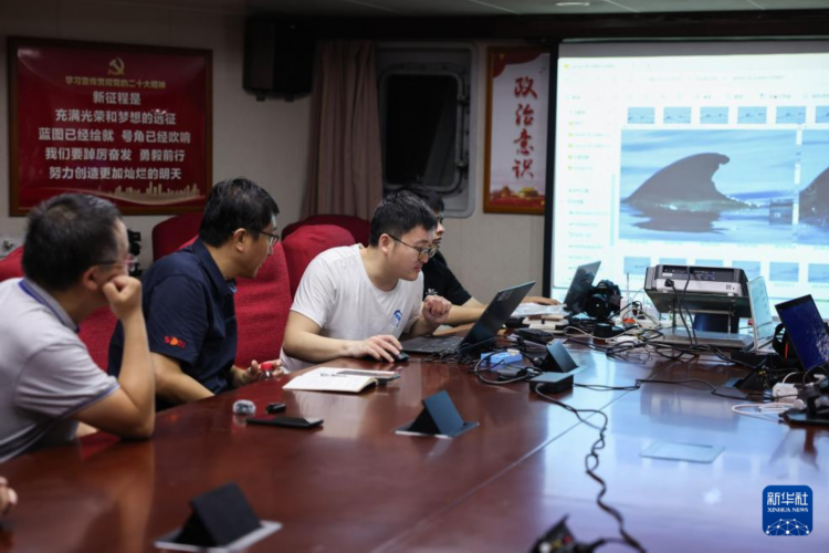 7月7日,在海南岛东部海域,考察团队在船上开会分析拍摄到的短肢领航鲸照片。新华社记者 张丽芸 摄