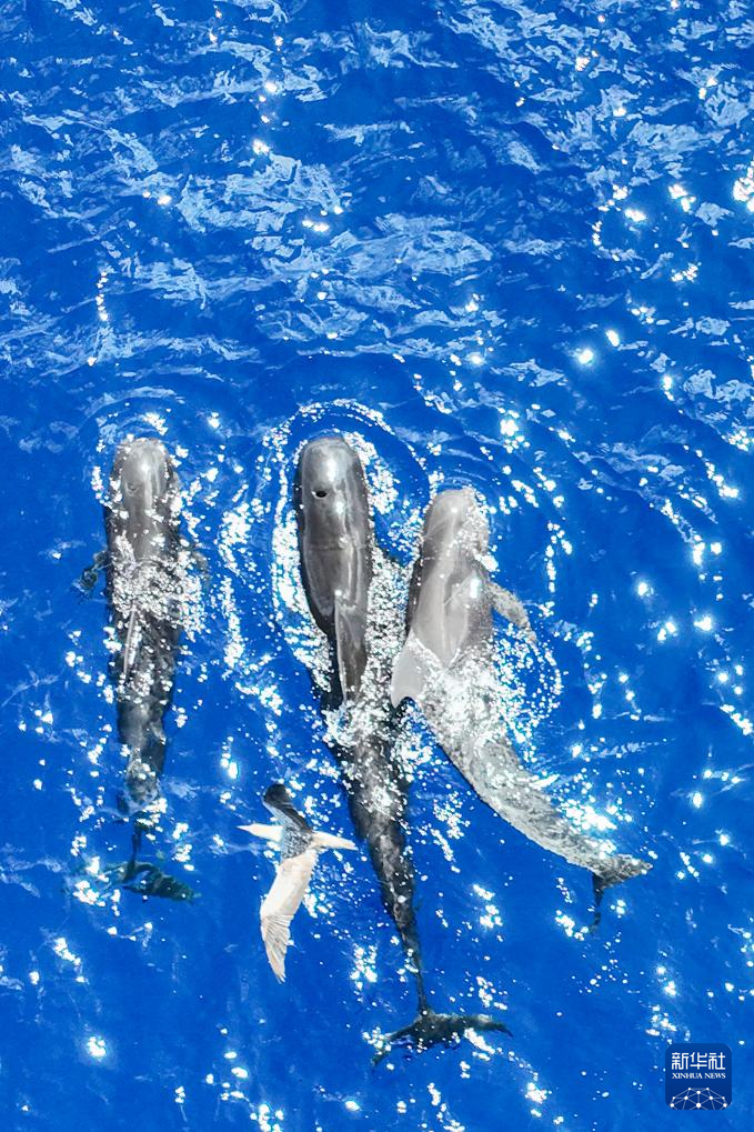 7月5日,一群短肢领航鲸在海南岛东部海域畅游(无人机照片)。新华社记者 张丽芸 摄