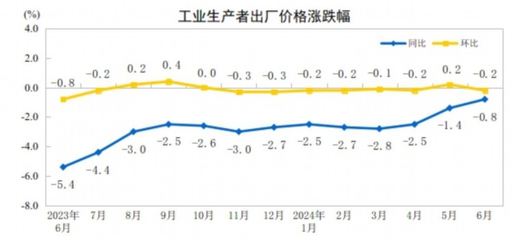 6月份,受国际大宗商品价格波动及国内部分工业品市场需求不足等因素影响,PPI环比由上月上涨0.2%转为下降0.2%;同比下降0.8%,降幅比上月收窄0.6个百分点。