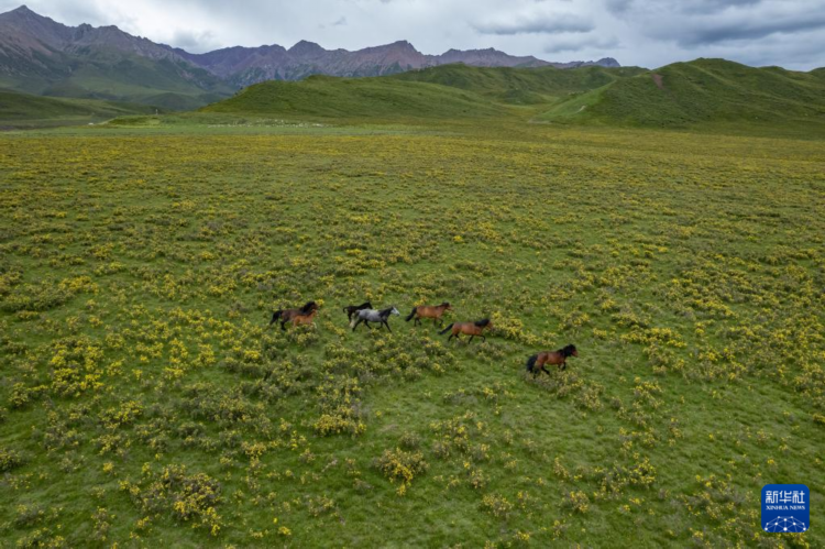 7月10日,在甘肃省张掖市肃南裕固族自治县皇城镇境内的祁连山脚下,马群在草原上奔跑(无人机照片)。
