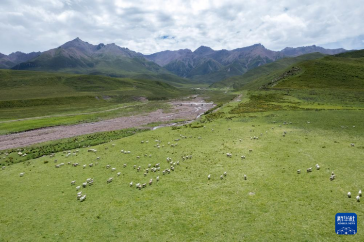 7月10日,在甘肃省张掖市肃南裕固族自治县皇城镇境内的祁连山脚下,羊群在草原上觅食(无人机照片)。