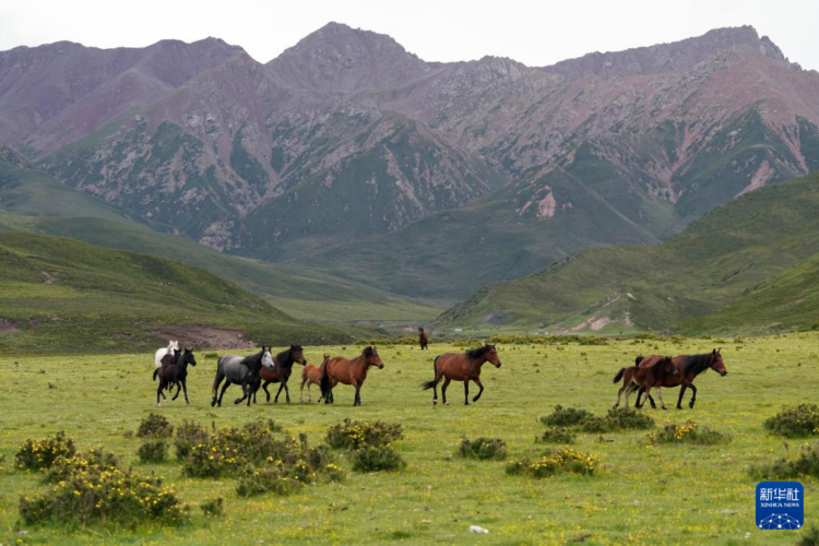 7月10日,在甘肃省张掖市肃南裕固族自治县皇城镇境内的祁连山脚下,马群在草原上奔跑。