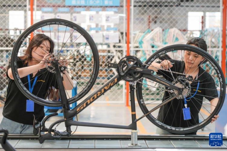 7月8日,在山东泰山瑞豹复合材料有限公司生产车间,工人在组装碳纤维自行车。