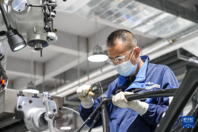 7月8日,在山东泰山瑞豹复合材料有限公司生产车间,工人在检测碳纤维自行车架。