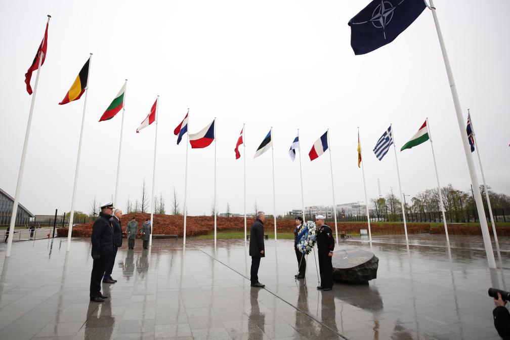 这是4月4日在比利时布鲁塞尔北约总部拍摄的北约成立75周年敬献花篮仪式。新华社记者赵丁喆摄