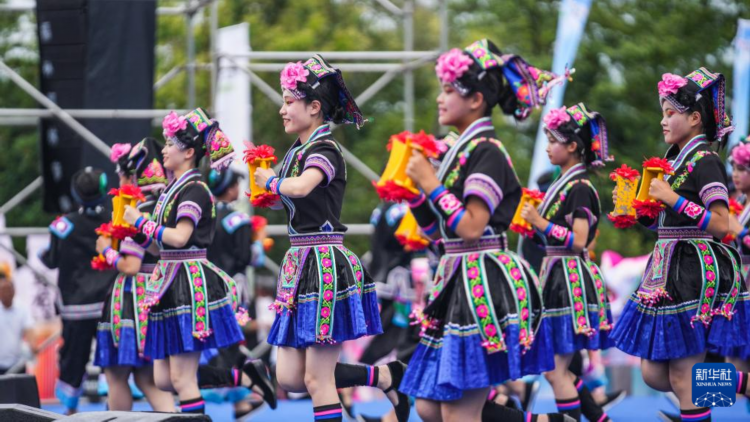 7月11日,当地群众在六盘水市六枝特区月亮河畔参加“六月六”庆祝活动。