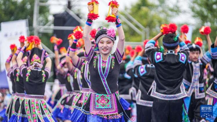 7月11日,当地群众在六盘水市六枝特区月亮河畔参加“六月六”庆祝活动时表演舞蹈。
