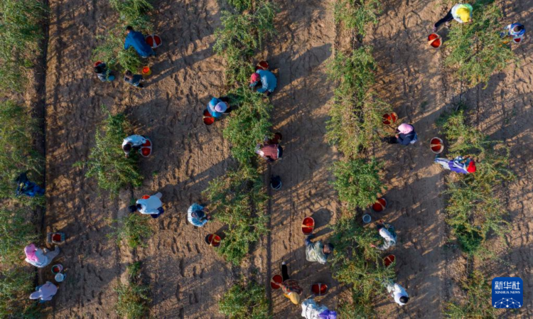 7月11日,在宁夏吴忠市同心县下马关镇五里墩村的枸杞生产基地,农户在采摘枸杞(无人机照片)。