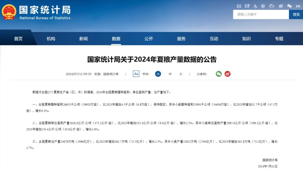 三、全国夏粮总产量14978万吨(2996亿斤),比2023年增加362.7万吨(72.5亿斤),增长2.5%。其中小麦产量13822万吨(2764亿斤),比2023年增加365.8万吨(73.2亿斤),增长2.7%。