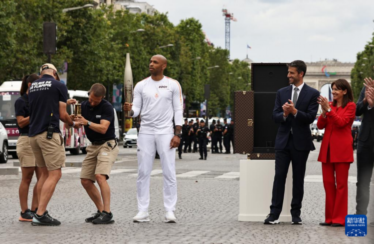 7月14日,在法国巴黎香榭丽舍大街,法国国奥队主教练、法国前足球运动员亨利(中)作为第一棒火炬手参加火炬传递。