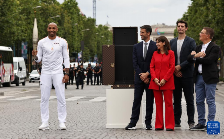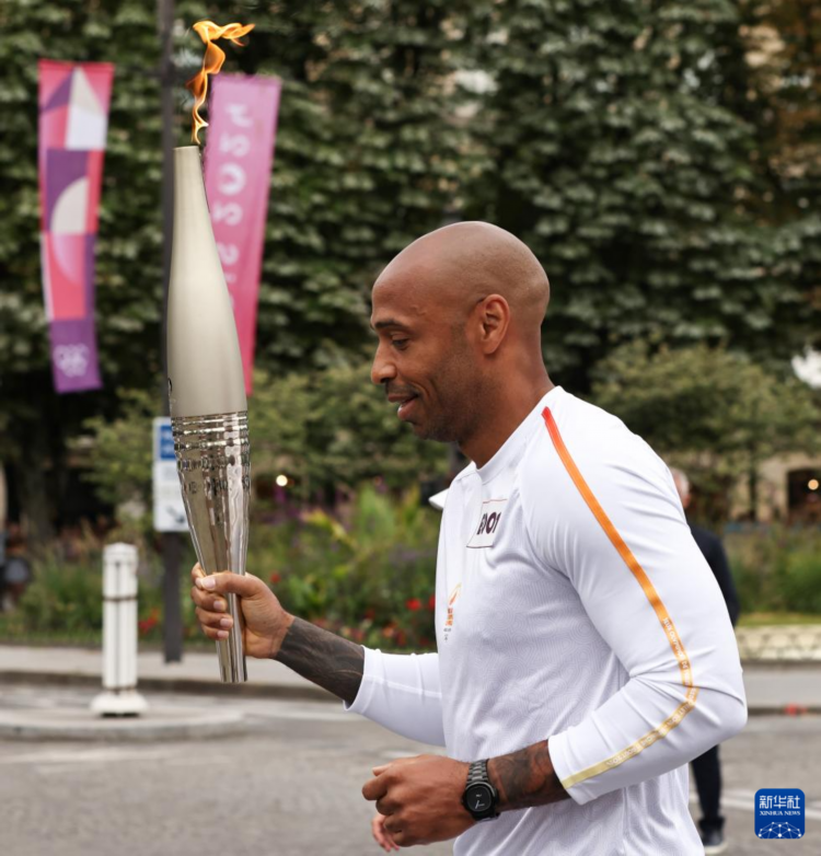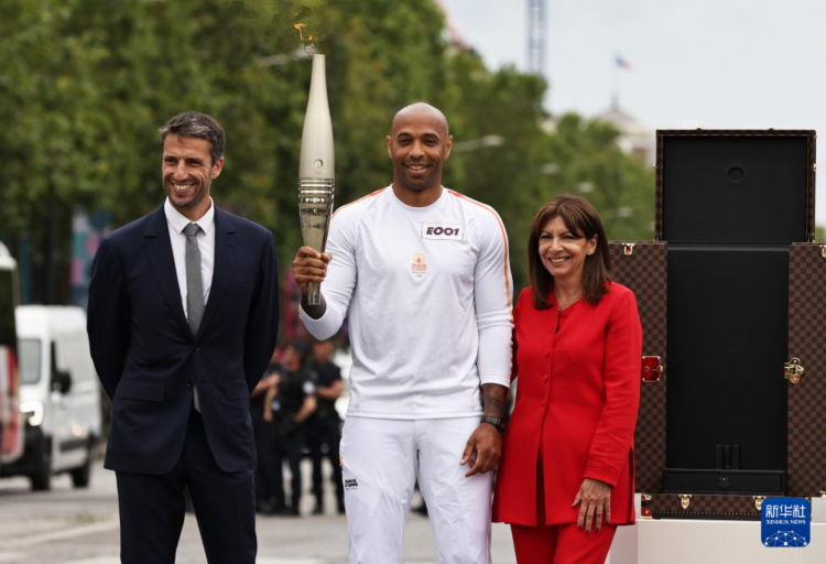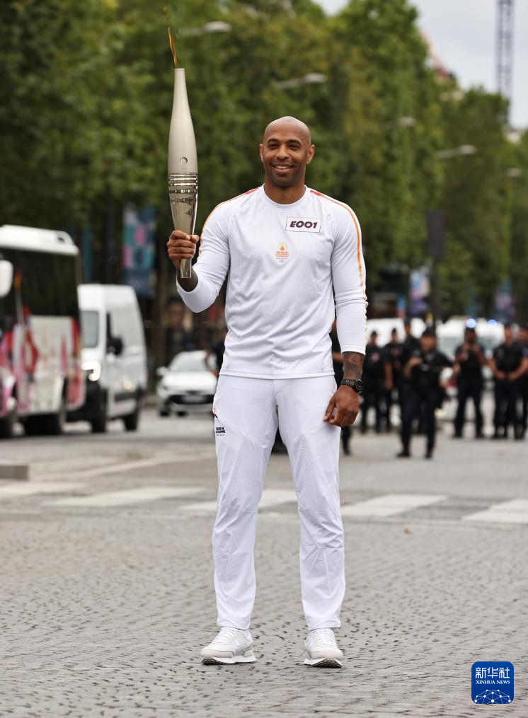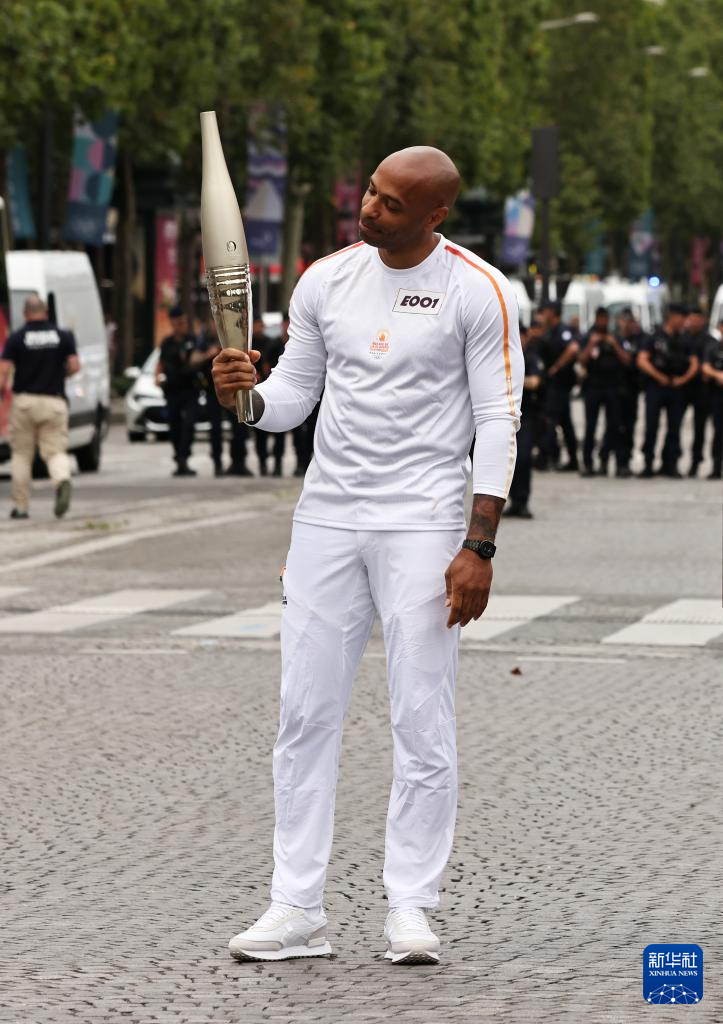 7月14日,在法国巴黎香榭丽舍大街,第一棒火炬手、法国国奥队主教练、法国前足球运动员亨利手持火炬传递。