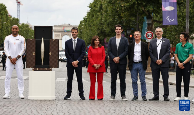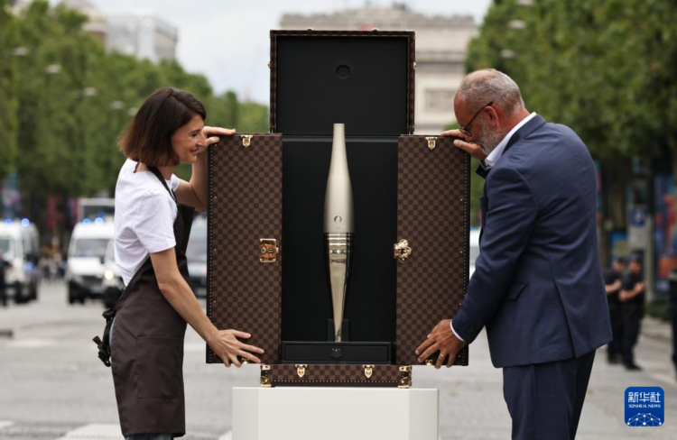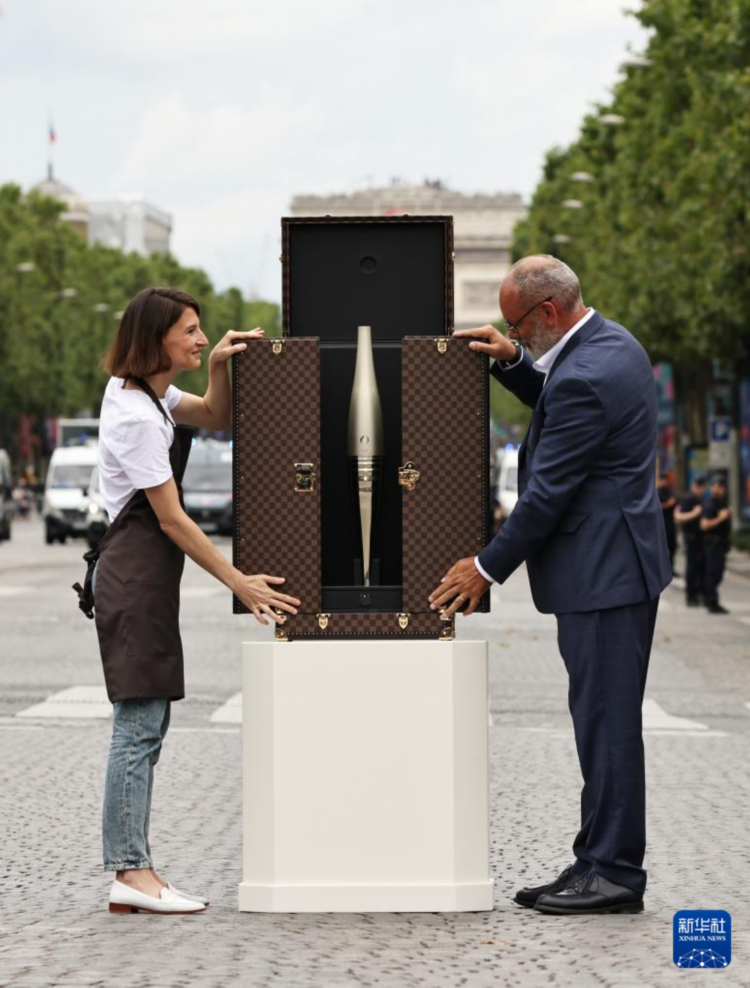 7月14日,在法国巴黎香榭丽舍大街,工作人员取出奥运火炬。