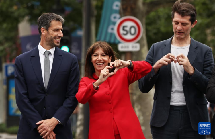 7月14日,在法国巴黎香榭丽舍大街,巴黎奥组委主席埃斯坦盖(左)和巴黎市长伊达尔戈(中)在火炬传递现场合影。