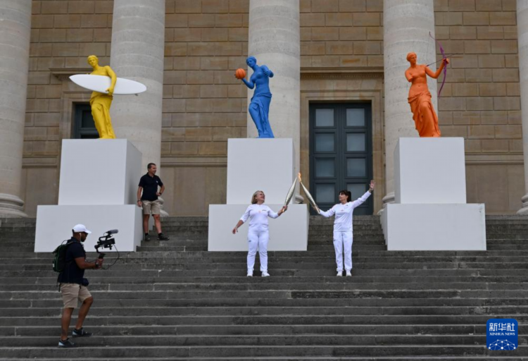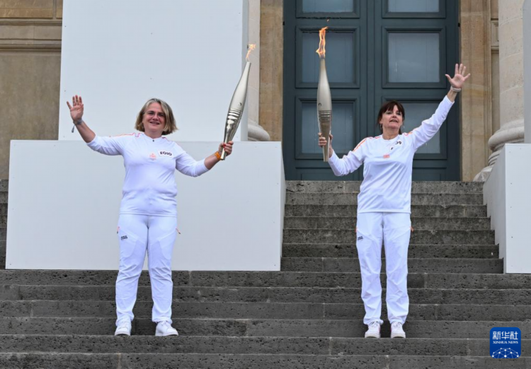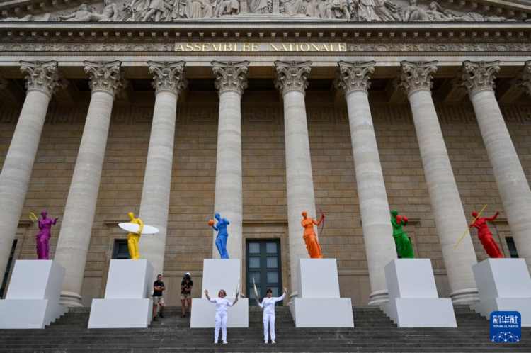 7月14日,在法国国民议会所在地——波旁宫,火炬手瓦莱丽·弗雷奥(右一)与火炬手维尔日妮·巴比内(右二)在传递圣火。