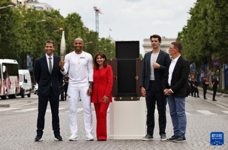 7月14日,在法国巴黎香榭丽舍大街,第一棒火炬手、法国国奥队主教练、前足球运动员亨利(左一)、巴黎奥组委主席托尼·埃斯坦盖(左二)在火炬传递现场。