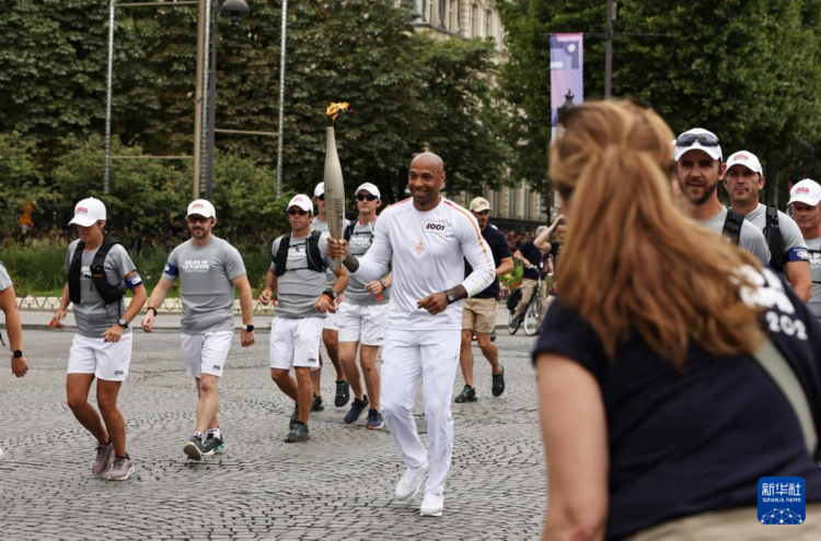 7月14日,在法国巴黎香榭丽舍大街,第一棒火炬手、法国国奥队主教练、法国前足球运动员亨利参加火炬传递。