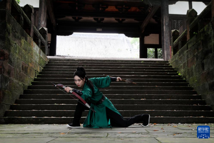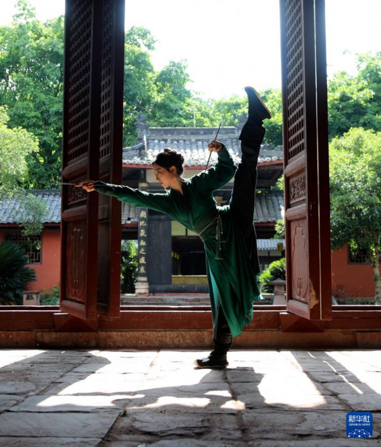 7月2日,“峨眉派女子功夫团”成员李诺菲在大庙飞来殿练习。