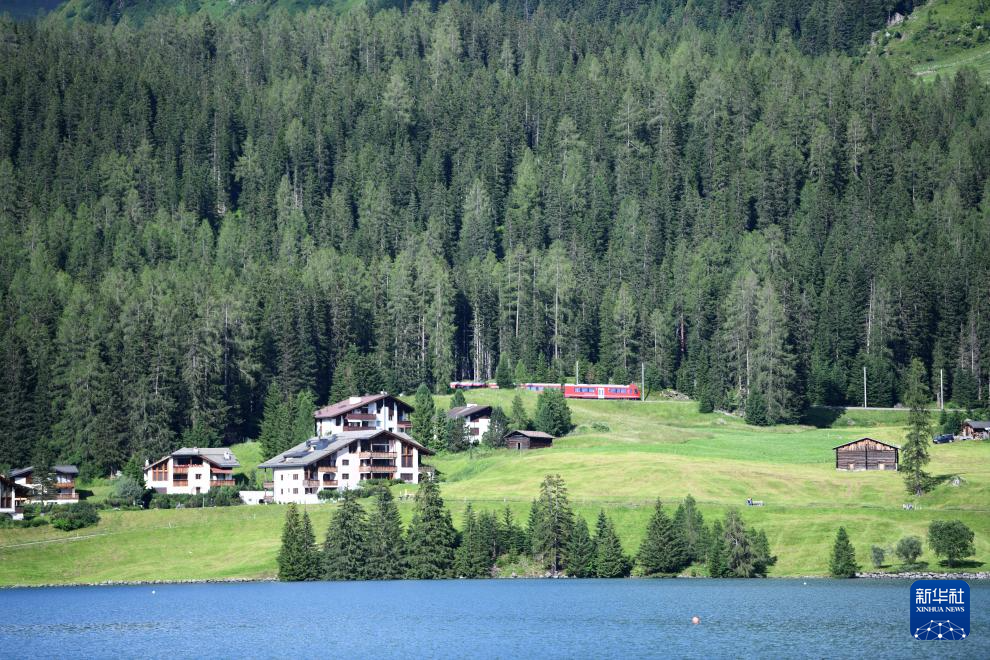 这是7月12日在瑞士达沃斯拍摄的火车穿行山间的风景。 夏天的瑞士达沃斯小镇,草木繁茂,绿意盎然。远山、湖水和民居交织成一幅幅迷人画卷。 新华社记者 连漪 摄