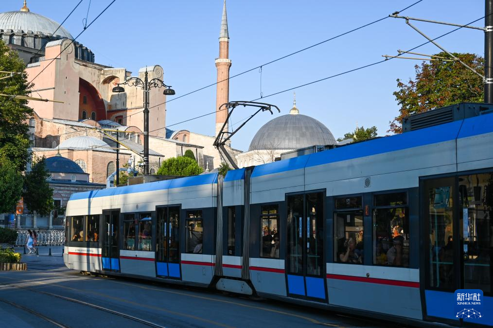 7月12日,一列有轨电车经过土耳其伊斯坦布尔历史区域的圣索菲亚大教堂。