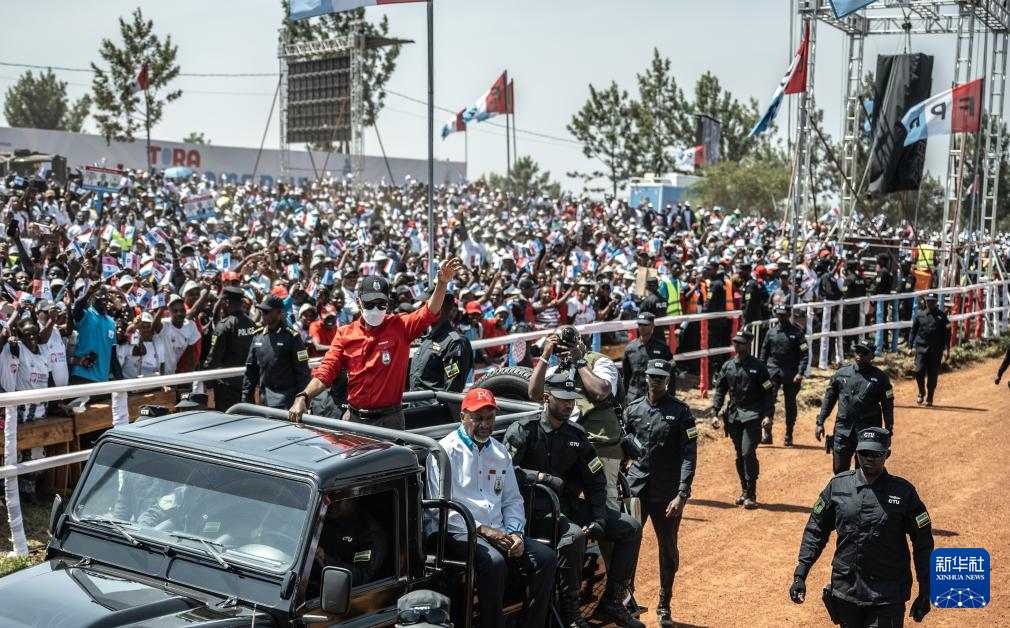 7月12日,卢旺达现任总统、卢旺达爱国阵线总统候选人保罗·卡加梅(前左一)在首都基加利举行的竞选活动上向支持者致意。 卢旺达大选将于7月15日举行。 新华社记者 王冠森 摄