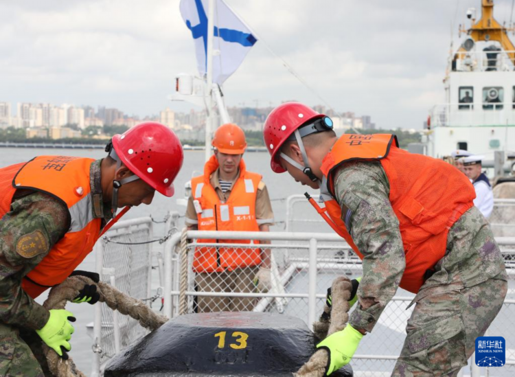 7月15日,中方军港保障人员为俄“响亮”号护卫舰解缆。新华社记者 黎云 摄