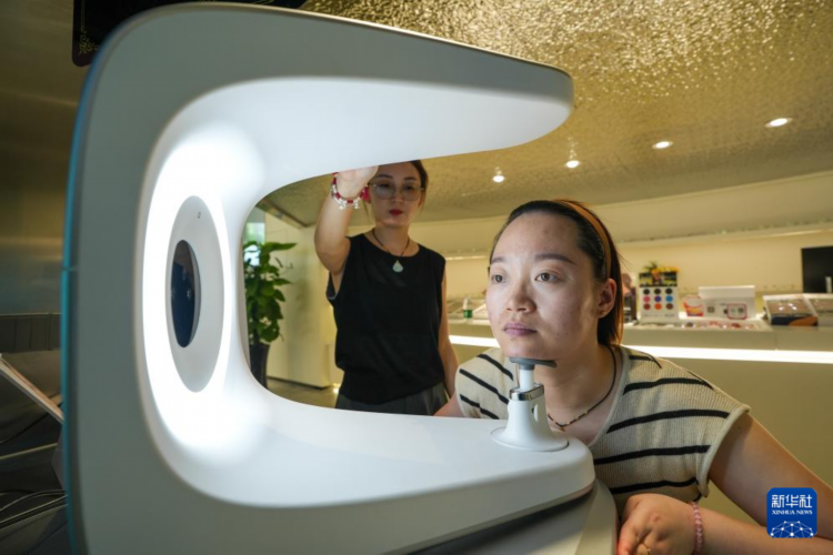 在江苏丹阳一家光学科技股份有限公司,消费者在体验3D面部扫描,制作专属镜框(7月15日摄)。