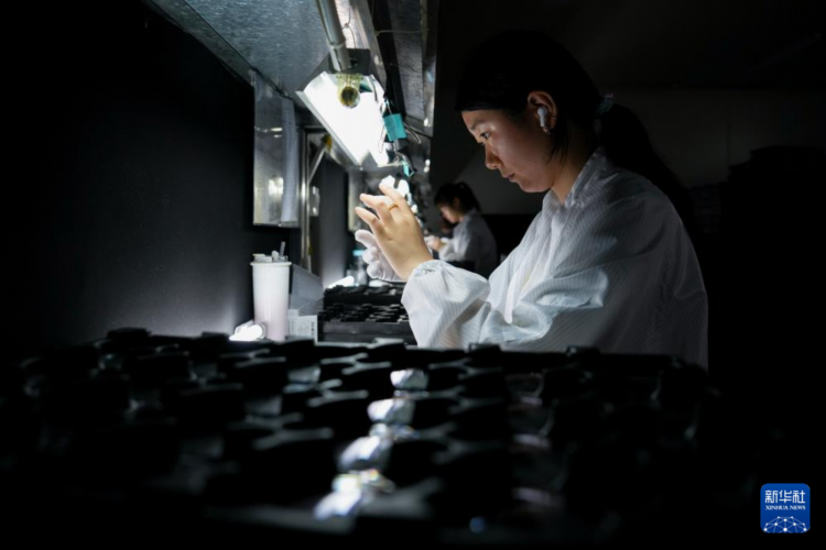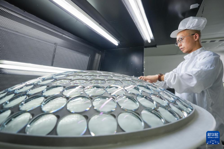 7月16日,在江苏丹阳一家光学眼镜有限公司,工作人员在镀膜车间内检查、填装镜片。