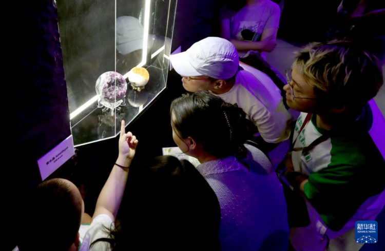 7月16日,参观者在一组产自巴西的玛瑙外壳紫水晶球体展品前驻足观看。