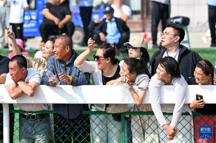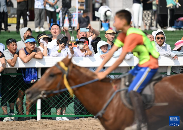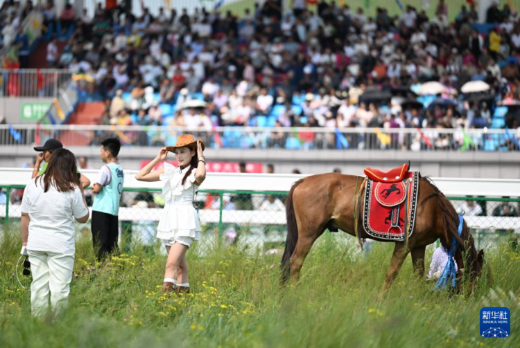 7月17日,游客在乌兰毛都苏木民族体育综合训练基地观看赛马比赛。