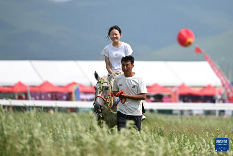 7月17日,游客(后)在乌兰毛都苏木民族体育综合训练基地体验骑马。